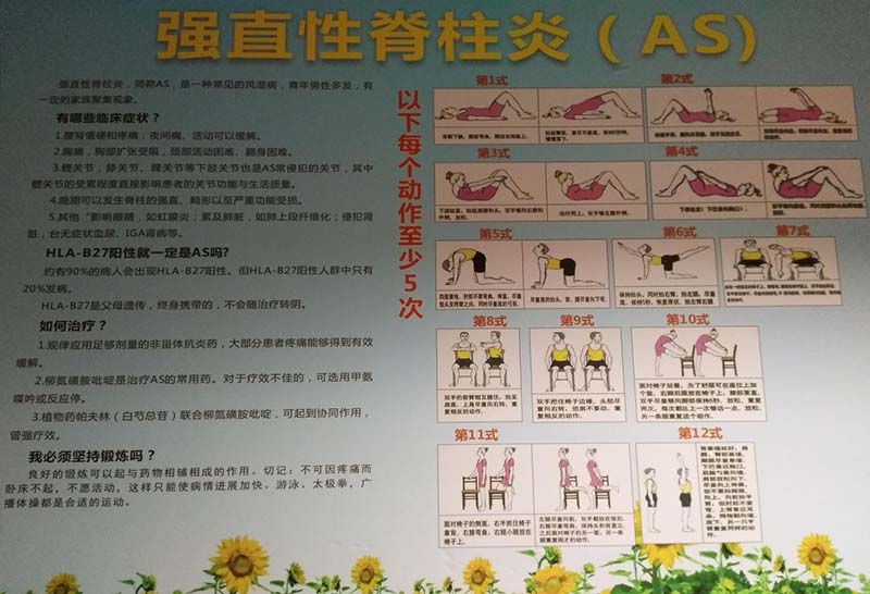 病房走廊悬挂科室常见病的康复锻炼,图文并茂,方便患者掌握,得到患者好评。