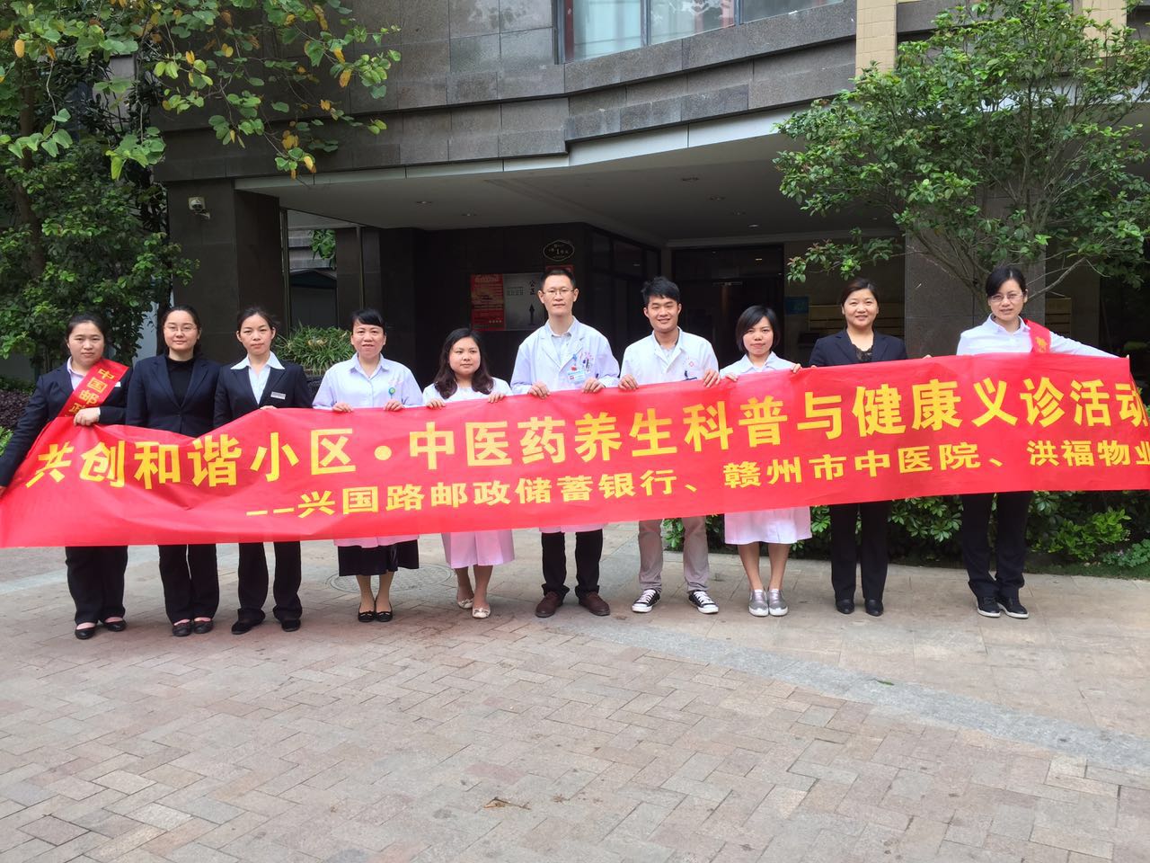 2017年4月15日上午,应邮政储蓄银行兴国路支行、盛世江南小区洪福物业邀请,赣州市中医院健康虔城青年志愿服务队的专家又一次来到盛世江南小区,为居民开展中医药养生科普与健康义诊活动。